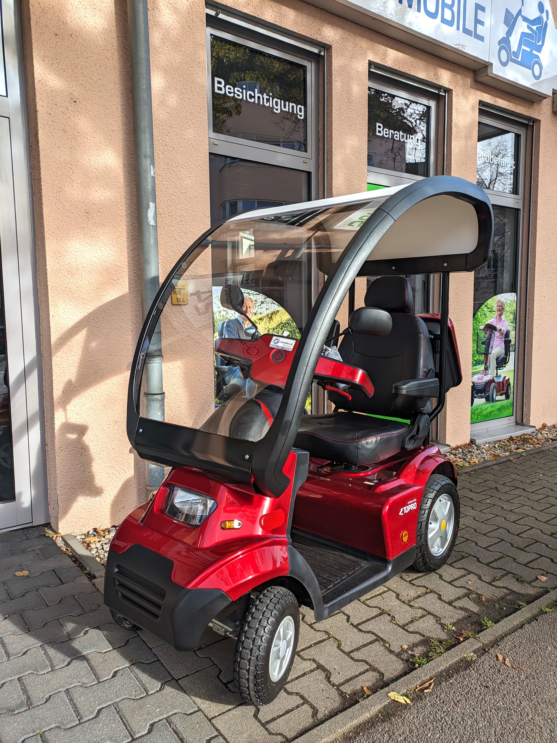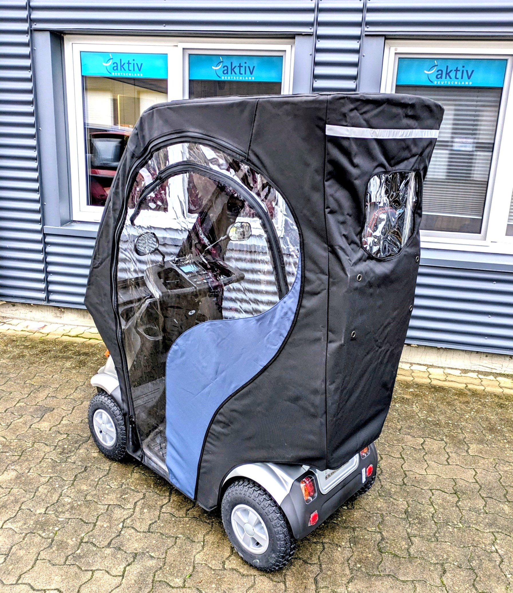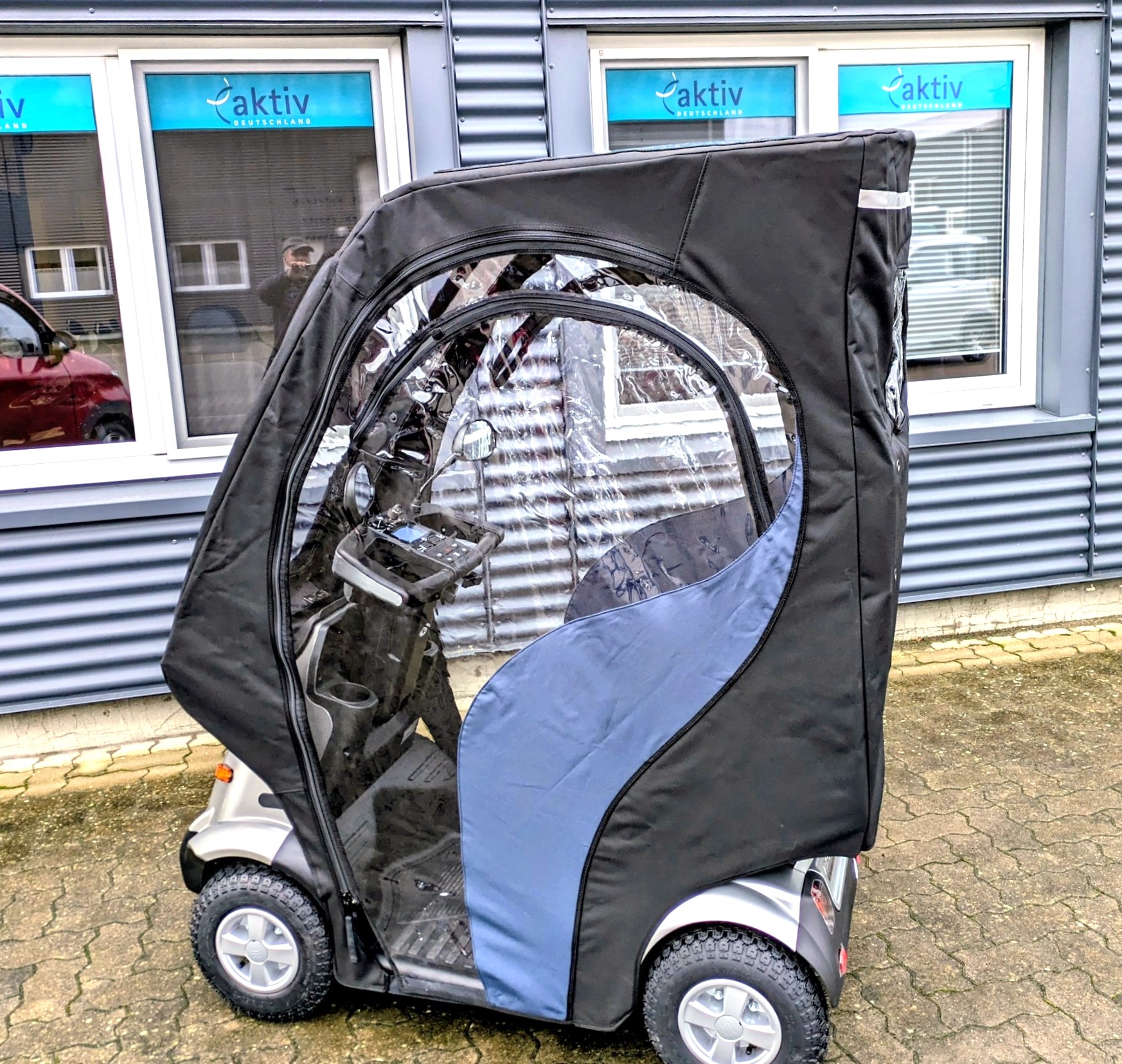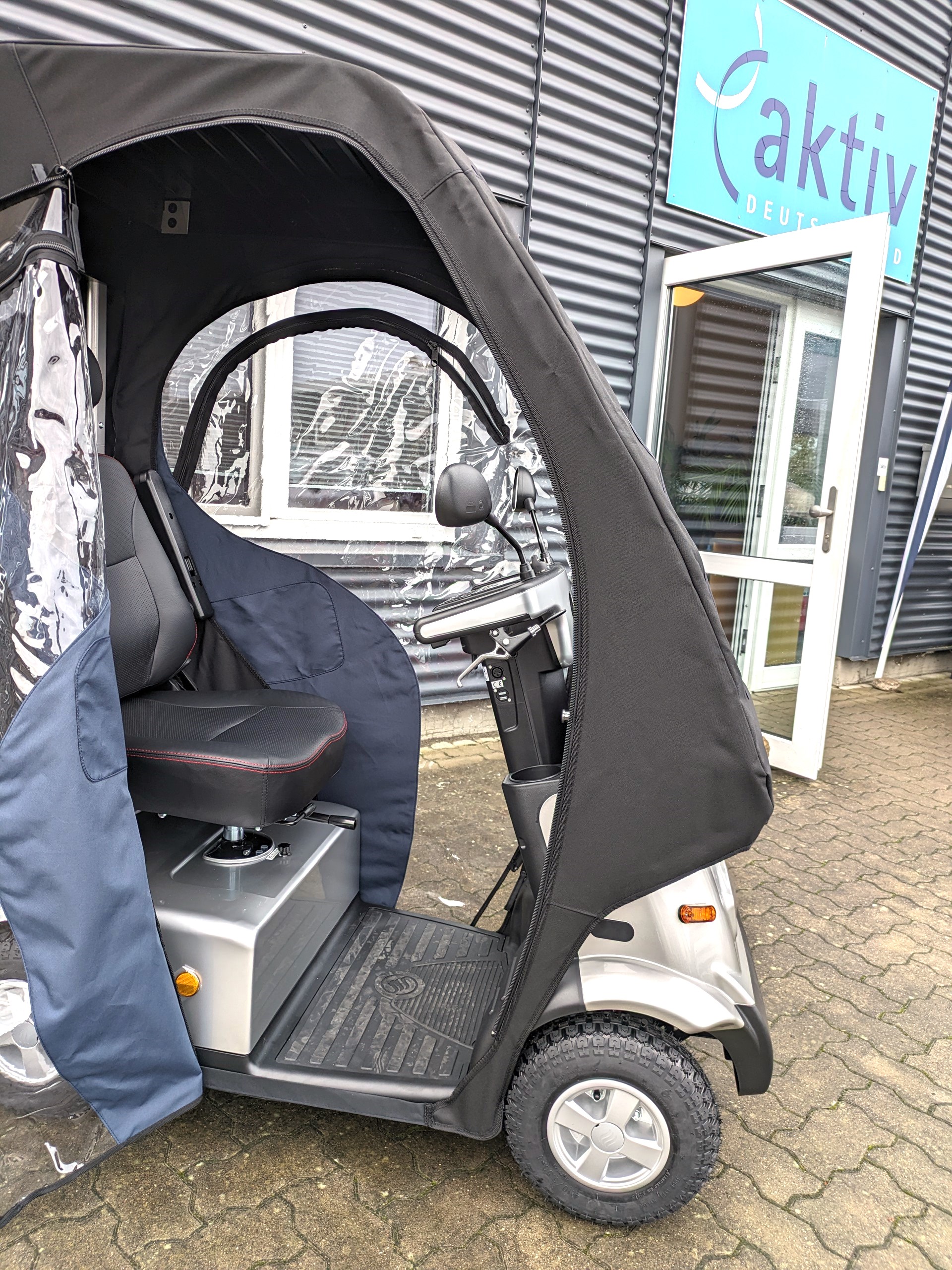 Hier finden Sie ein kompaktes Seniorenmobil, welches mit Wetterdach und Seitenverkleidungen einen kompletten Rundum-Regenschutz bietet. In der Sommersaison können die Seitenteile entfernt werden.